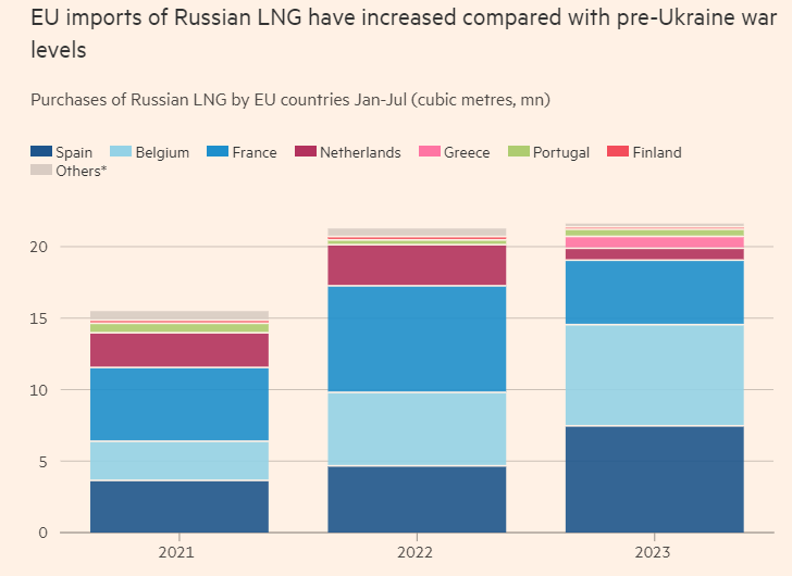 歐盟今年前7個月進口的俄羅斯液化天然氣總量刷新了2022年同期創下的記錄,增加了1.7%;與2021年同期相比,漲幅更是高達40%。
