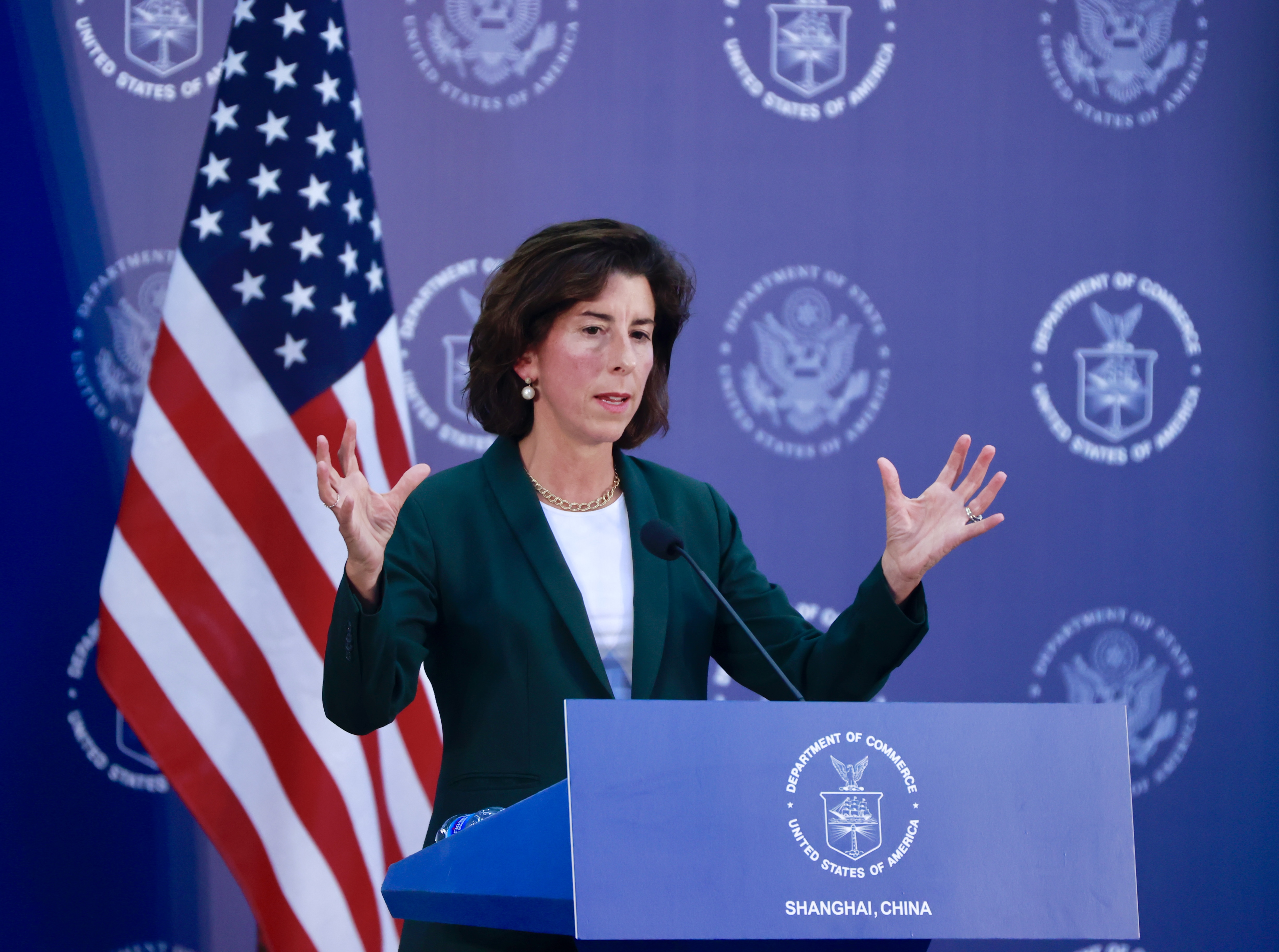 2023年8月30日下午,上海,美國商務部長雷蒙多舉行發佈會,介紹其訪華行程並回答現場中外媒體的提問。 圖源:視覺中國