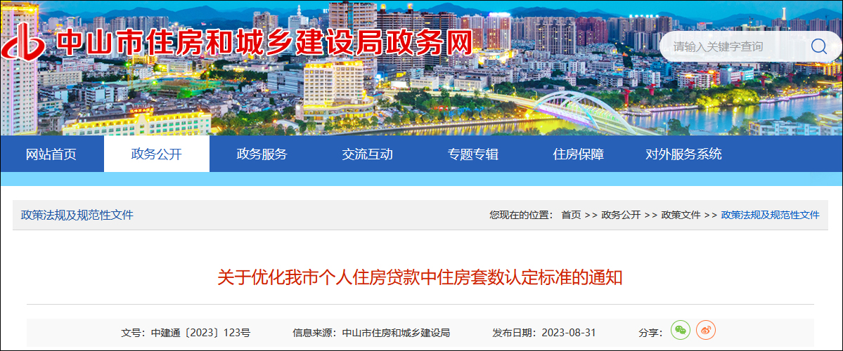 同一天,廣東中山市住房和城鄉建設局網站發佈通知稱,居民家庭(包括借款人、配偶及未成年子女,下同)申請貸款購買商品住房時,家庭成員在當地名下無成套住房的,不論是否已利用貸款購買過住房,銀行業金融機構均按首套住房執行住房信貸政策;中山市自然資源局根據居民家庭申請或授權,提供家庭住房套數查詢服務並出具查詢結果,銀行業金融機構據此執行。本通知自印發之日起施行,原有政策與本通知不一致的,以本通知為準。