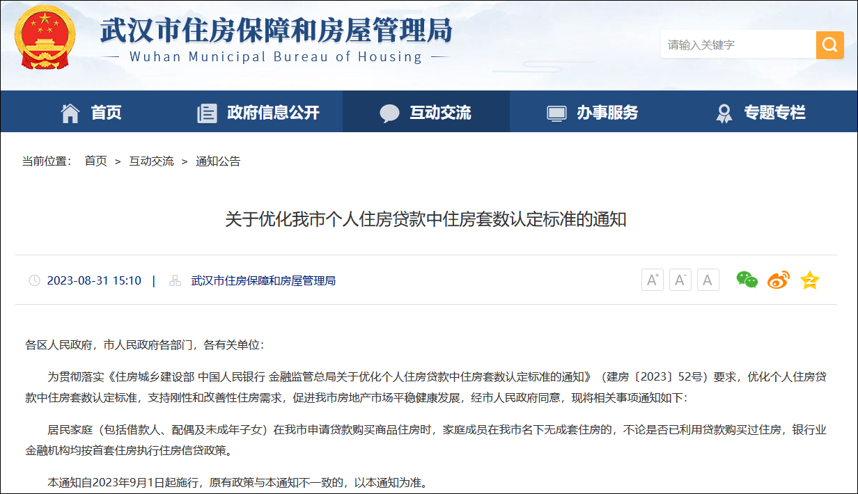 8月31日,武漢市住房保障和房屋管理局網站發佈《關於優化我市個人住房貸款中住房套數認定標準的通知》稱,居民家庭(包括借款人、配偶及未成年子女)在我市申請貸款購買商品住房時,家庭成員在我市名下無成套住房的,不論是否已利用貸款購買過住房,銀行業金融機構均按首套住房執行住房信貸政策。本通知自2023年9月1日起施行,原有政策與本通知不一致的,以本通知為準。