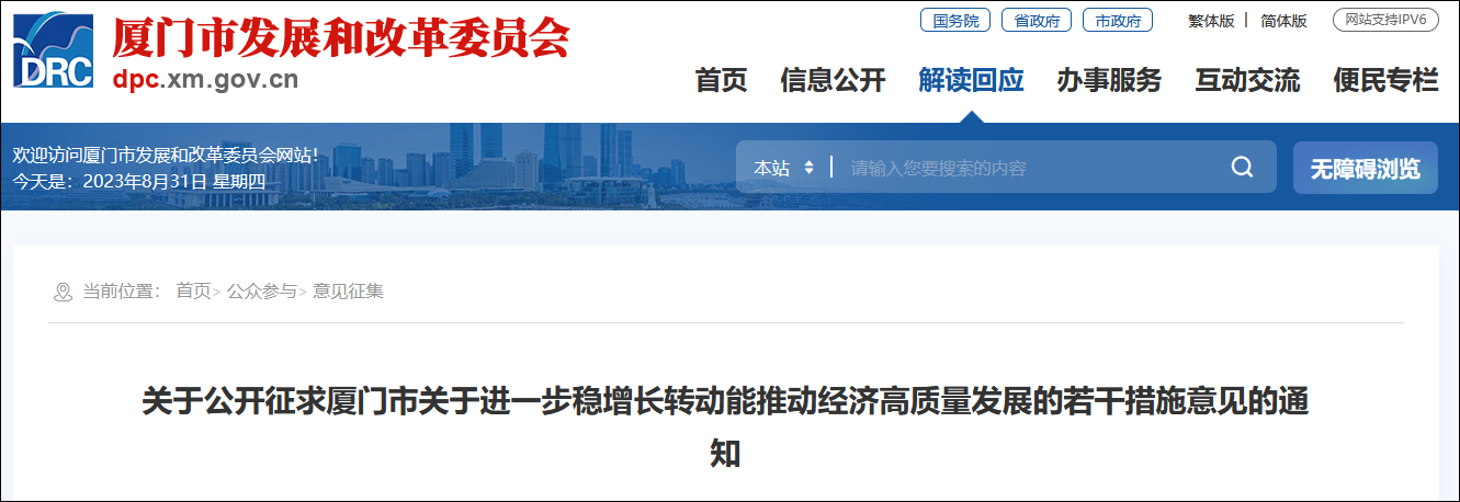 廈門市發改委網站8月29日發佈關於公開徵求廈門市《關於進一步穩增長轉動能推動經濟高質量發展的若干措施意見的通知》。