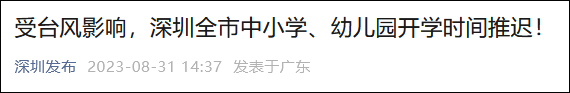 以深圳為例,微信公眾號“深圳發佈”31日14:37發佈消息稱,“蘇拉”目前已進入該市500公里防區,受“蘇拉”影響,全市中小學、幼兒園秋季學期開學時間從9月1日推遲至9月4日,各高校要適當調整學生返校時間,確保在校師生安全,停止一切非必要的户外活動。