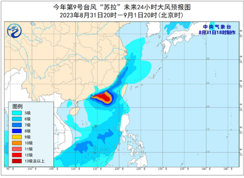 據中國氣象局網站消息,中央氣象台8月31日18時繼續發佈颱風紅色預警:今年第9號颱風“蘇拉”(超強颱風級)的中心今天(31日)下午5點鐘位於廣東省汕尾市東偏南方大約275公里的南海東北部海面上,就是北緯21.4度、東經117.6度,中心附近最大風力有16級(55米/秒),中心最低氣壓為930百帕,七級風圈半徑250-280公里,十級風圈半徑130公里,十二級風圈半徑70公里。