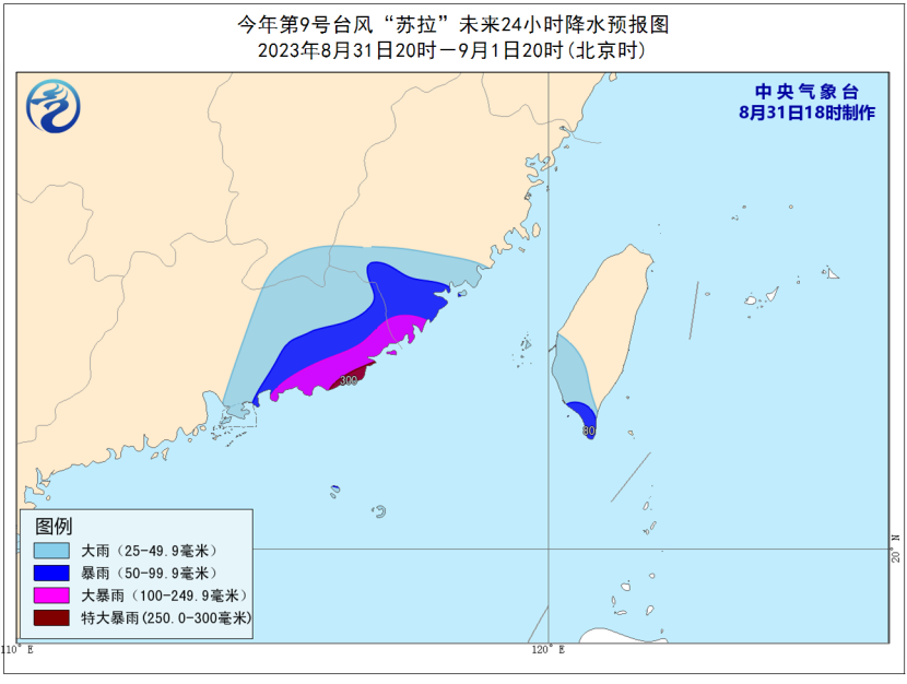 降水預報:8月31日20時至9月1日20時,廣東東部、福建南部和台灣島南部等地有大到暴雨,其中,廣東東南部、福建東南部等地部分地區有大暴雨,廣東東南部局地有特大暴雨(250-300毫米)。