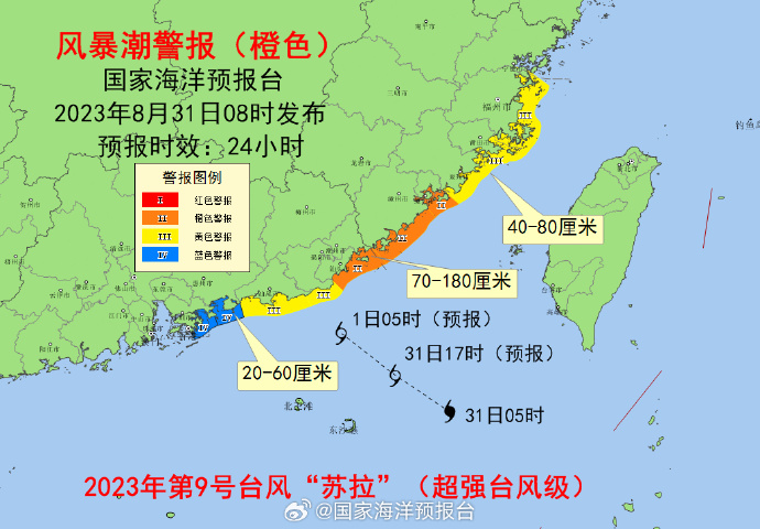 風暴潮方面,預計8月31日上午至9月1日中午,福建福州至泉州沿海將出現40到80釐米的風暴增水,福建廈門至廣東汕尾沿海將出現70到180釐米的風暴增水,廣東惠州和深圳沿海將出現20到60釐米的風暴增水。福建省廈門市、漳州市、廣東省潮州市和汕頭市的風暴潮預警級別為橙色,福建省福州市、莆田市、泉州市、廣東省揭陽市和汕尾市的風暴潮預警級別為黃色。