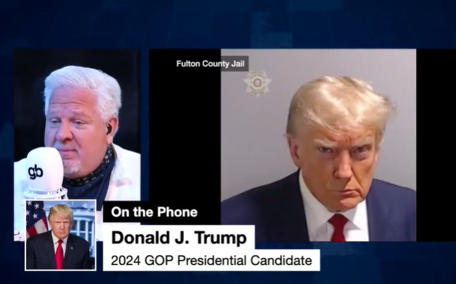 格倫·貝克與特朗普電話連線,特朗普配圖為其在富爾頓縣監獄拍攝的嫌犯照(視頻截圖)