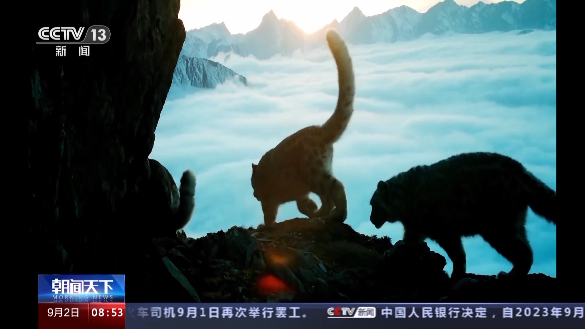 另一個畫面中,一隻毛茸茸的雪豹闊步走進了白色大熊貓的棲息地。這隻雪豹被記錄到多年、多次繁育。目前,它帶着三隻幼崽居住在白色大熊貓棲息地附近的巖洞中,經常被紅外相機拍攝到一家結伴外出,漫步在羣山之巔,白雲之上。