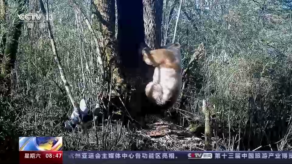 卧龍國家級自然保護區管理局高級工程師劉明衝:這個母熊貓好像發現了,它在樹洞裏面好像聽到聲音了,然後它就有一個動作,跟這個小的熊貓發一個指令,就是這個小的熊貓就趕緊去驅趕這個白熊貓。然後根據這種形態,因為三貓同框的這種情況是很罕見的。我們推測站在樹洞裏面的大熊貓應該是它們的母親。