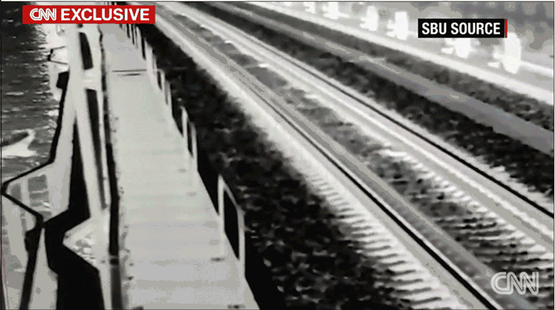 烏方提供的克里米亞大橋鐵路段7月17日受襲時的監控畫面
