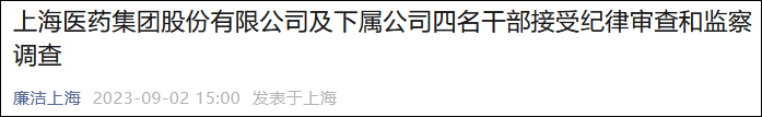 上海醫藥集團股份有限公司及下屬公司四名幹部被查