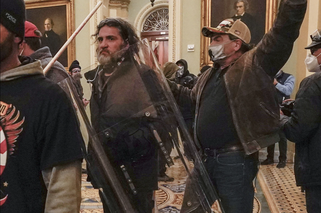 佩佐拉在“國會山騷亂”現場拿着警察的盾牌。圖自美聯社