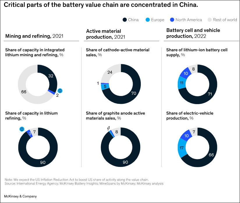麥肯錫研究同時警告稱,在汽車電池方面,歐洲對中國的依賴度很高:2021年,中國擁有90%的鋰精煉能力,2022年有71%的電池在中國製造。