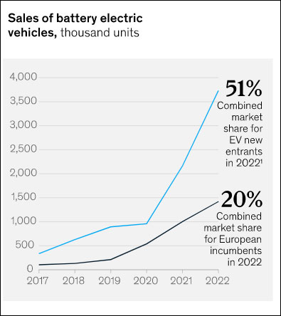 歐洲主要車企(黑色實線)與中美新興力量(藍色實線)的電動汽車銷量變化(單位:千輛,圖源:麥肯錫)