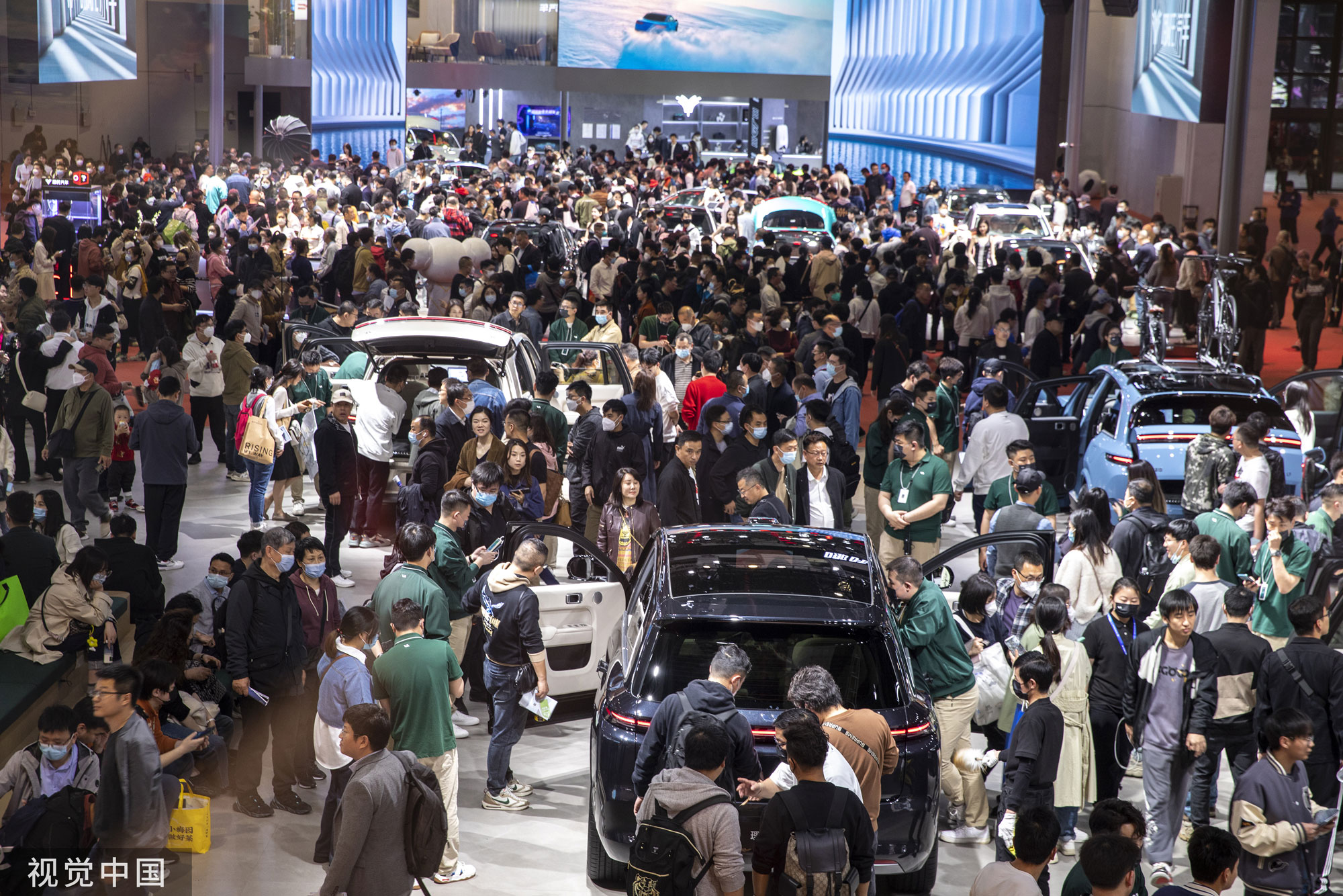 2023年4月24日,2023上海車展開展第7天,國產新能源車展台上呈現大客流。(圖源:視覺中國)