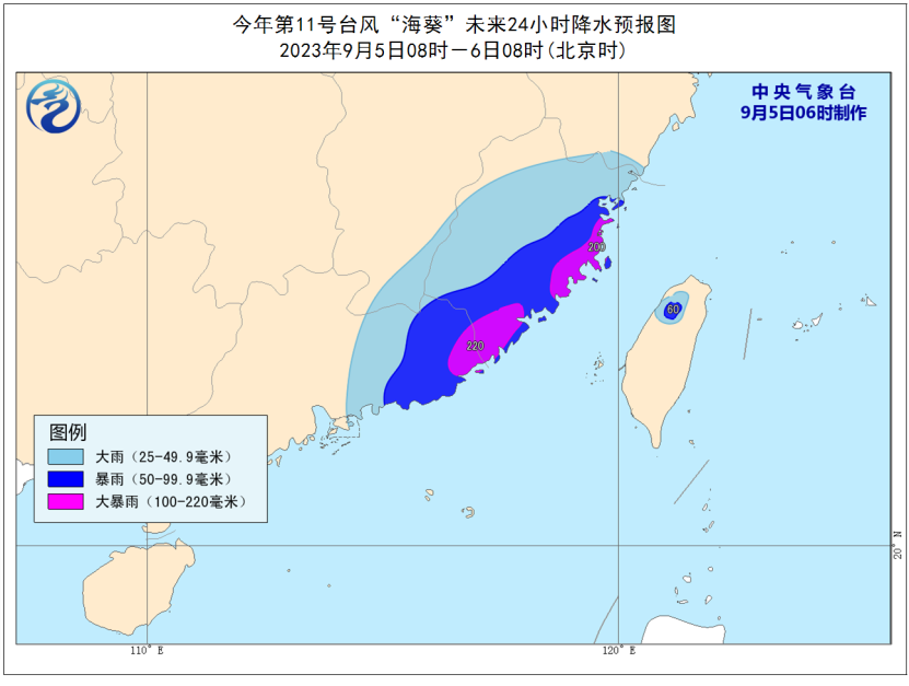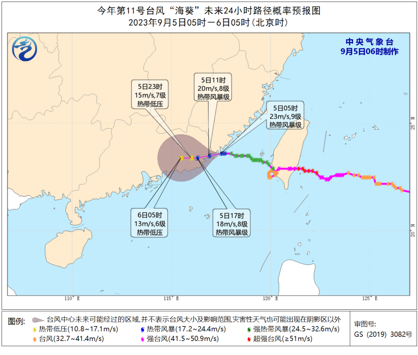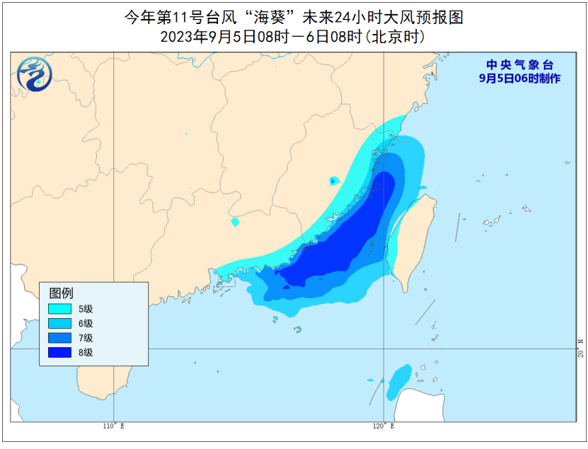 大風預報:9月5日08時至6日08時,台灣海峽、東海西南部、南海東北部以及福建沿海、廣東中東部沿海將有6-8級、陣風9-10級大風。