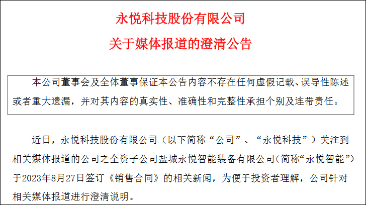 9月4日,永悦科技發佈《關於媒體報道的澄清公告》稱,近日,永悦科技股份有限公司(以下簡稱“公司”、“永悦科技”)關注到相關媒體報道的公司之全資子公司鹽城永悦智能裝備有限公司(簡稱“永悦智能”)於2023年8月27日簽訂《銷售合同》的相關新聞,為便於投資者理解,公司針對相關媒體報道進行澄清説明。