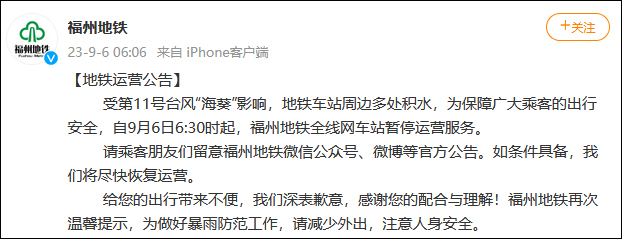 @福州地鐵 9月6日6:06發佈地鐵運營公告稱,受第11號颱風“海葵”影響,地鐵車站周邊多處積水,為保障廣大乘客的出行安全,自9月6日6:30時起,福州地鐵全線網車站暫停運營服務。
