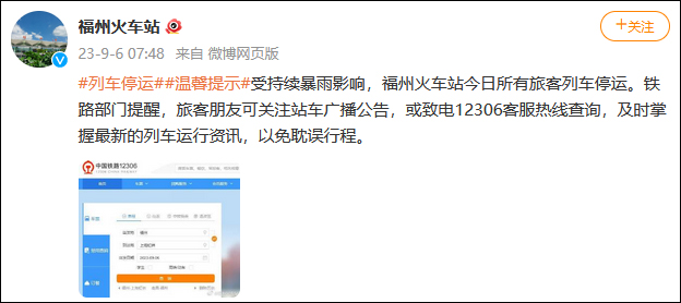 @福州火車站 6日發佈提示稱,受持續暴雨影響,福州火車站今日所有旅客列車停運。鐵路部門提醒,旅客朋友可關注站車廣播公告,或致電12306客服熱線查詢,及時掌握最新的列車運行資訊,以免耽誤行程。