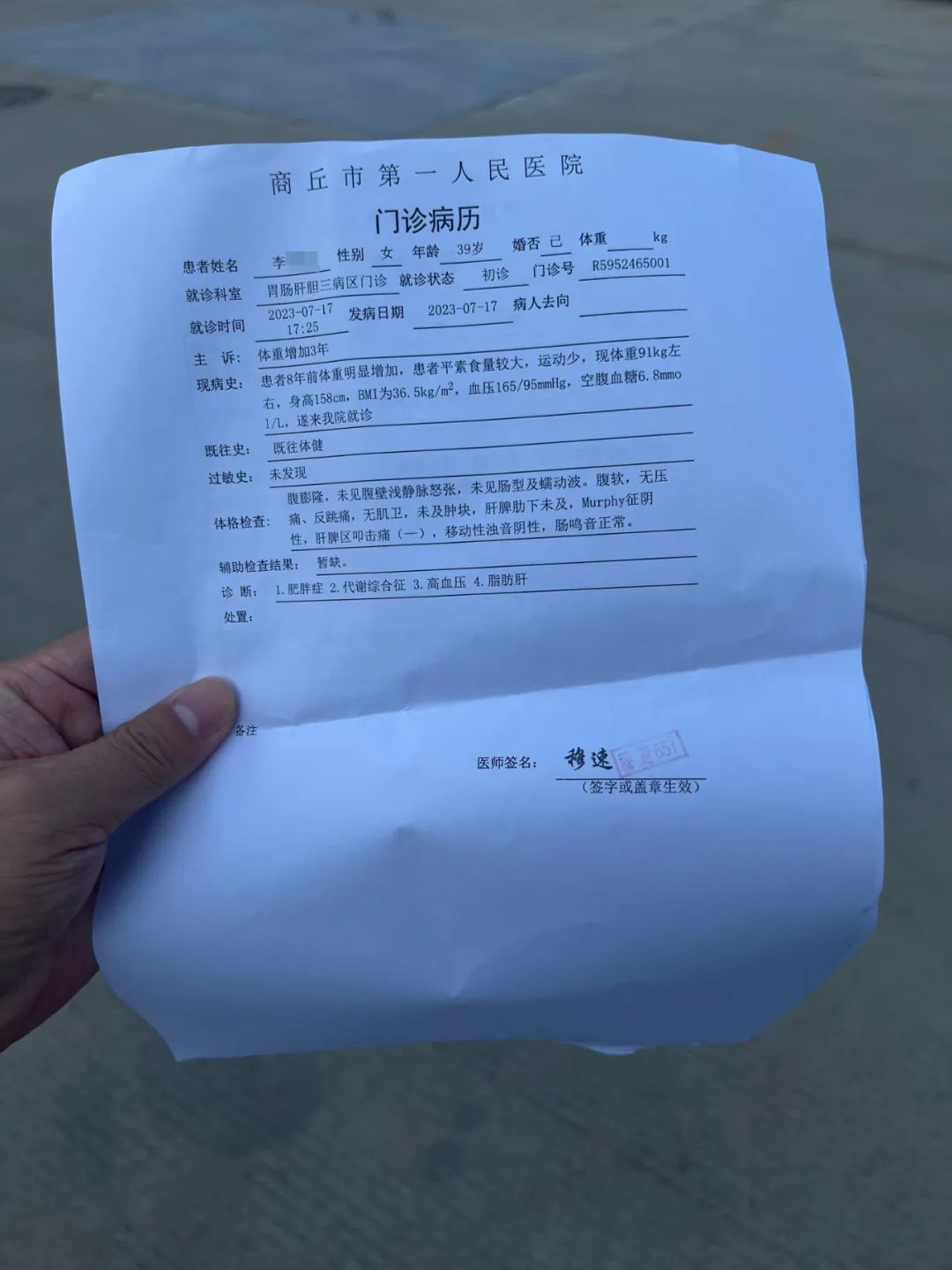 《門診病歷》在“現病史”寫道,血壓165/95mmHg、空腹血糖6.8mmo1/L。 《診斷證明書》的“診斷意見”則列出了該“胖友”有四種病症:肥胖症、代謝綜合徵、高血壓和脂肪肝;“治療經過及處理意見”是:患者診斷考慮肥胖症、代謝綜合徵,經節食、運動等保守治療後,效果欠佳,建議行手術治療,改善代謝情況。