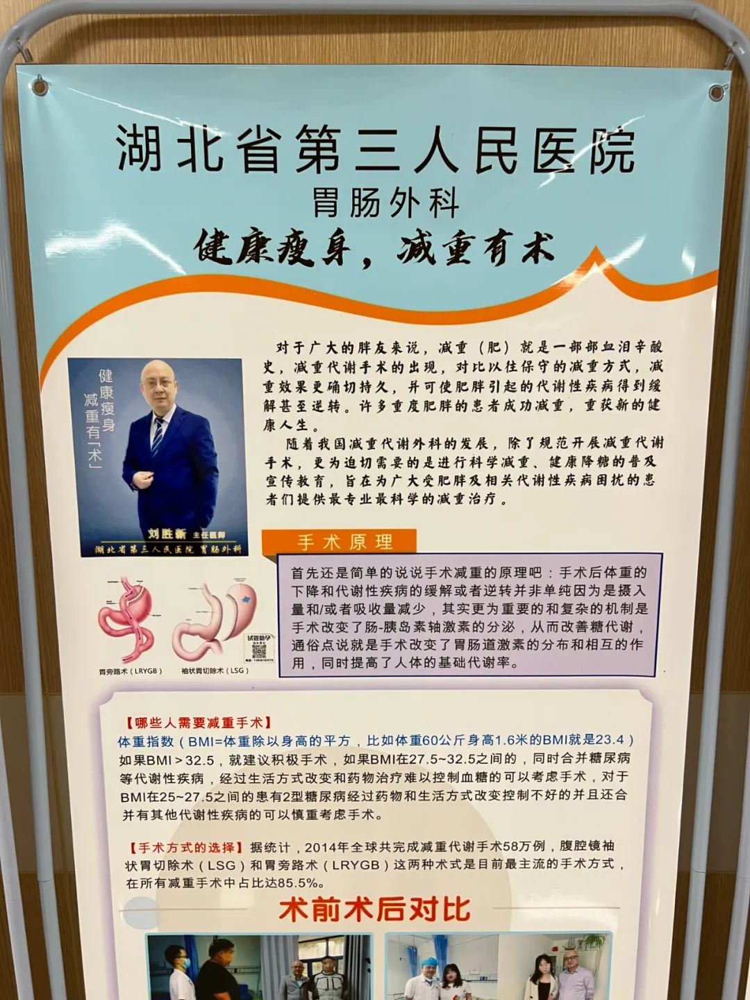 湖北省第三人民醫院又名湖北省中山醫院,是一所綜合性大型三級甲等醫院,其本部院區位於武漢市礄口區中山大道。綜合樓的三樓是胃腸外科。胃腸外科掛有“健康瘦身、減重有術”的宣傳展板,展板裏有關於“手術原理”“哪些人需要減重手術”“手術方式的選擇”的介紹以及切胃者術前術後對比的身形圖片展示。主任醫師劉勝新身穿西裝的半身像處於展板的左上位置,非常突出。