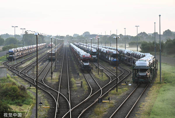 當地時間2023年9月2日,德國埃姆登,貨運列車搭載大眾旗下汽車。