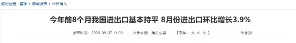 海關總署:今年前8月進出口總值27.08萬億元,微降0.1%