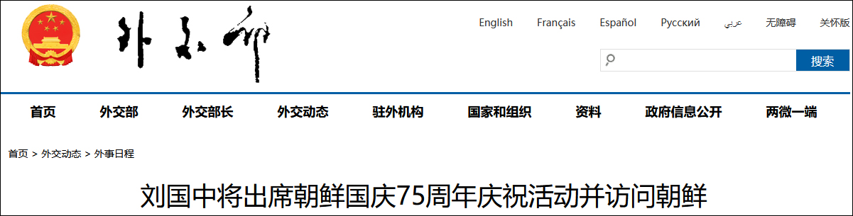 劉國中將出席朝鮮國慶75週年慶祝活動並訪問朝鮮 None 2023-09-07 據外交部網站9月7日消息,外交部發言人毛寧宣佈:應朝鮮勞動黨和政府邀請,中共中央政治局委員、國務院副總理劉國中將率中國黨政代表團於9月8日起出席朝鮮國慶75週年慶祝活動並訪問朝鮮。
