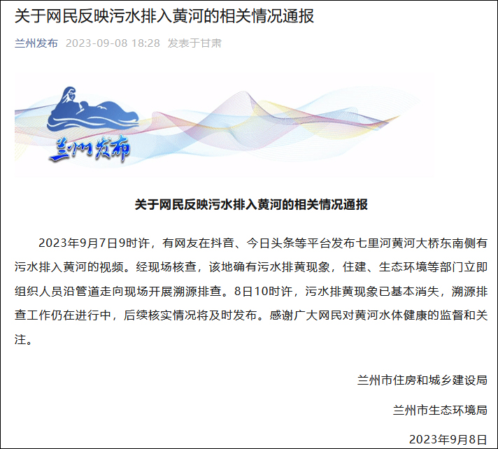 據微信公眾號“蘭州發佈”消息,9月8日,蘭州市住房和城鄉建設局、蘭州市生態環境局發佈《關於網民反映污水排入黃河的相關情況通報》。