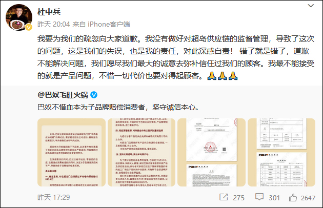 9月7日,巴奴發文承認羊肉卷確實含有鴨肉成分後,杜中兵9月7日晚也發文道歉,稱沒有做好對超島供應鏈的監督管理,導致了這次的問題。“這是我們的失誤,也是我的責任,對此深感自責。”