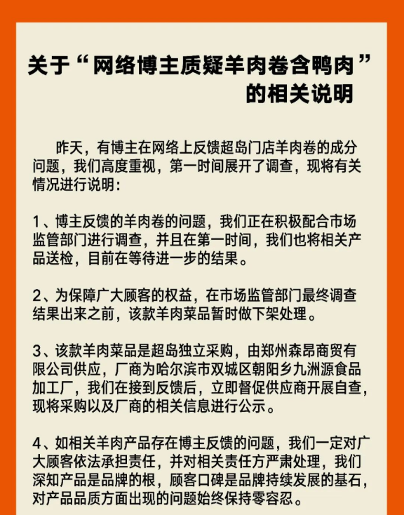 微信公眾號“超島”9月5日發佈《關於羊肉卷的情況説明》稱,公司正積極配合市場監管部門進行調查,並且在第一時間將相關產品送檢,目前等待進一步結果。聲明中稱,為保障廣大顧客的權益,在市場監管部門最終調查結果出來之前,對涉事羊肉菜品暫時做下架處理。
