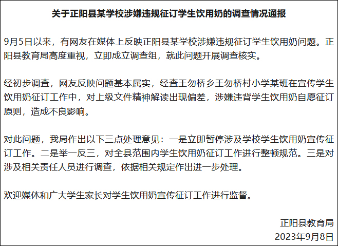 《情況通報》稱,9月5日以來,有網友在媒體上反映正陽縣某學校涉嫌違規徵訂學生飲用奶問題。正陽縣教育局高度重視,立即成立調查組,就此問題開展調查核實。
