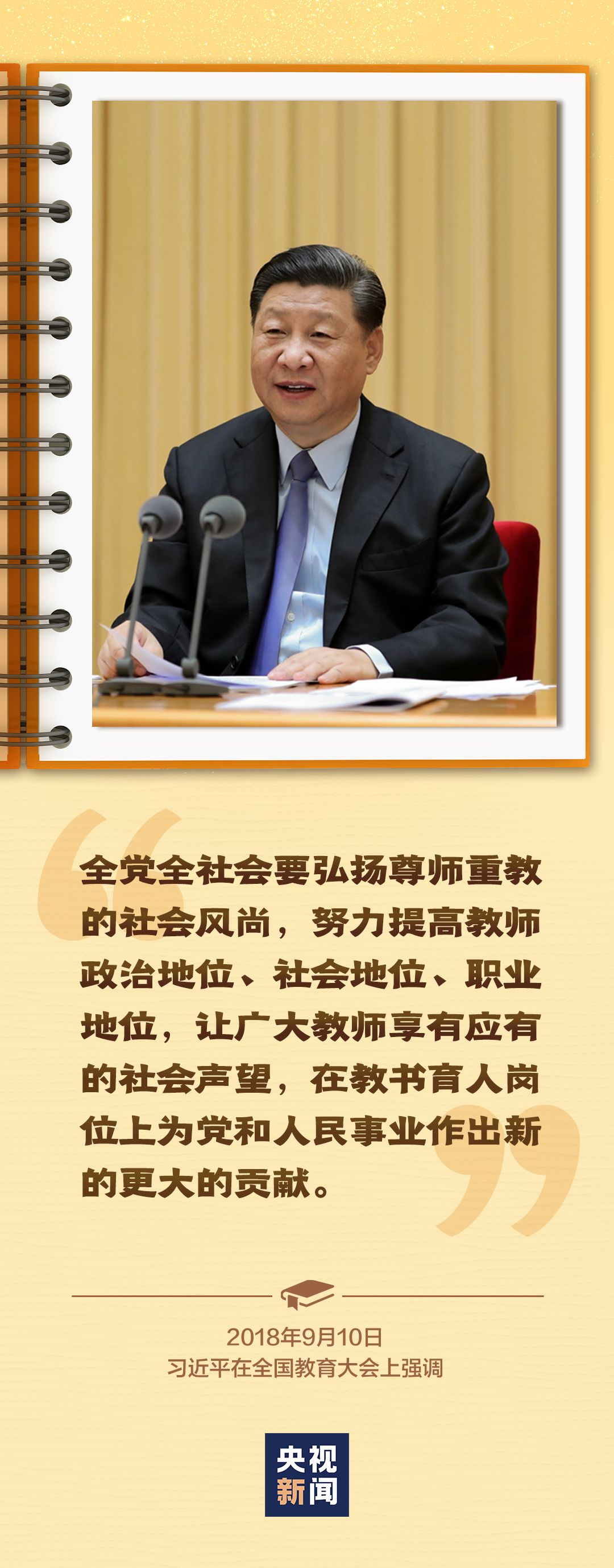 2018年9月,習近平總書記在全國教育大會上強調,全黨全社會要弘揚尊師重教的社會風尚,努力提高教師政治地位、社會地位、職業地位,讓廣大教師享有應有的社會聲望,在教書育人崗位上為黨和人民事業作出新的更大的貢獻。