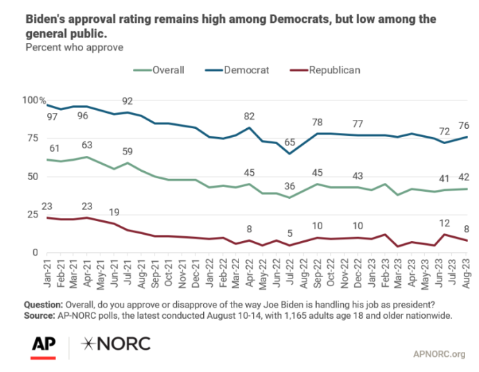 美聯社8月中旬的全國民調顯示,拜登執政的總體滿意率為42%,對其經濟政策的認可率只有36%。圖自AP