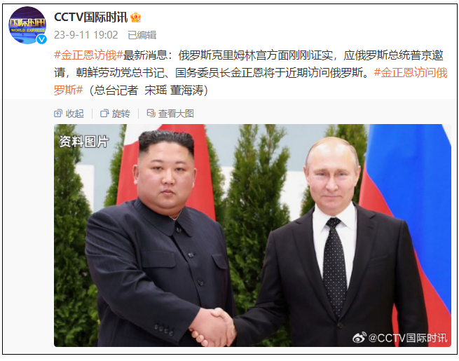克里姆林宮:金正恩將訪俄 None 2023-09-11 @CCTV國際時訊 9月11日最新消息:俄羅斯克里姆林宮方面剛剛證實,應俄羅斯總統普京邀請,朝鮮勞動黨總書記、國務委員長金正恩將於近期訪問俄羅斯。 (總枱記者 宋瑤 董海濤)