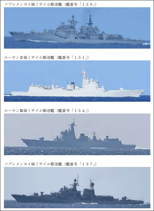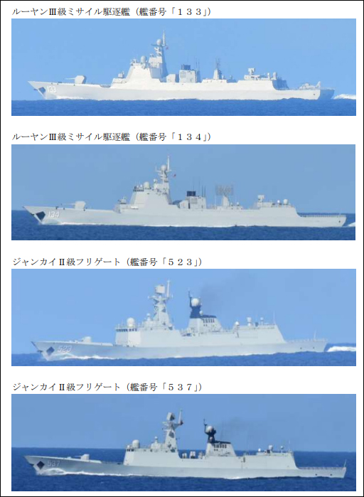 此外,當地時間11日上午8時左右,日本海上自衞隊在沖繩縣東北約230公里海域,發現一艘052C型導彈驅逐艦(151“鄭州艦”)、一艘052D型導彈驅逐艦(154“廈門艦”)及一艘現代級導彈驅逐艦(137“福州艦”)向南行駛。
