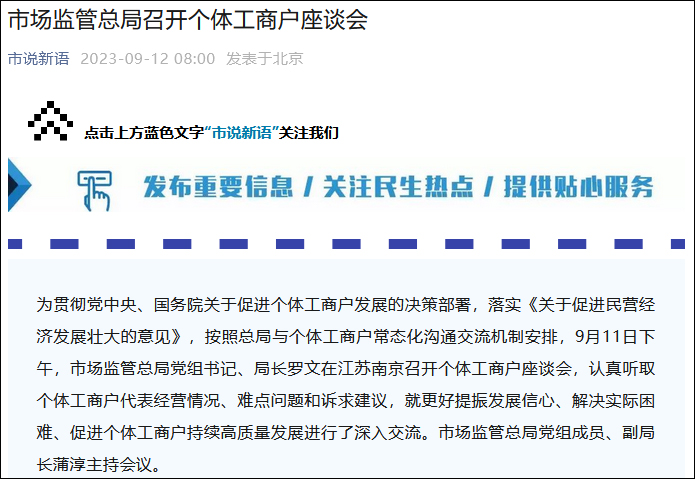 據國家市場監督管理總局微信公眾號“市説新語”9月12日消息,為貫徹黨中央、國務院關於促進個體工商户發展的決策部署,落實《關於促進民營經濟發展壯大的意見》,按照總局與個體工商户常態化溝通交流機制安排,9月11日下午,市場監管總局黨組書記、局長羅文在江蘇南京召開個體工商户座談會,認真聽取個體工商户代表經營情況、難點問題和訴求建議,就更好提振發展信心、解決實際困難、促進個體工商户持續高質量發展進行了深入交流。市場監管總局黨組成員、副局長蒲淳主持會議。