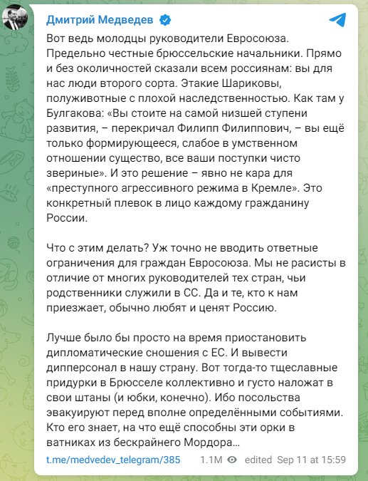 梅德韋傑夫11日在社交平台上發文稱,歐盟領導人“直接了當地告訴俄羅斯人:你們對於我們來説是二等公民”。