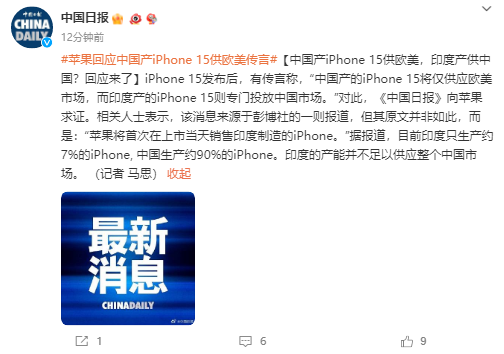 對此,《中國日報》向蘋果求證。相關人士表示,該消息來源於彭博社的一則報道,但其原文並非如此,而是:“蘋果將首次在上市當天銷售印度製造的iPhone。”據報道,目前印度只生產約7%的iPhone, 中國生產約90%的iPhone。印度的產能並不足以供應整個中國市場。