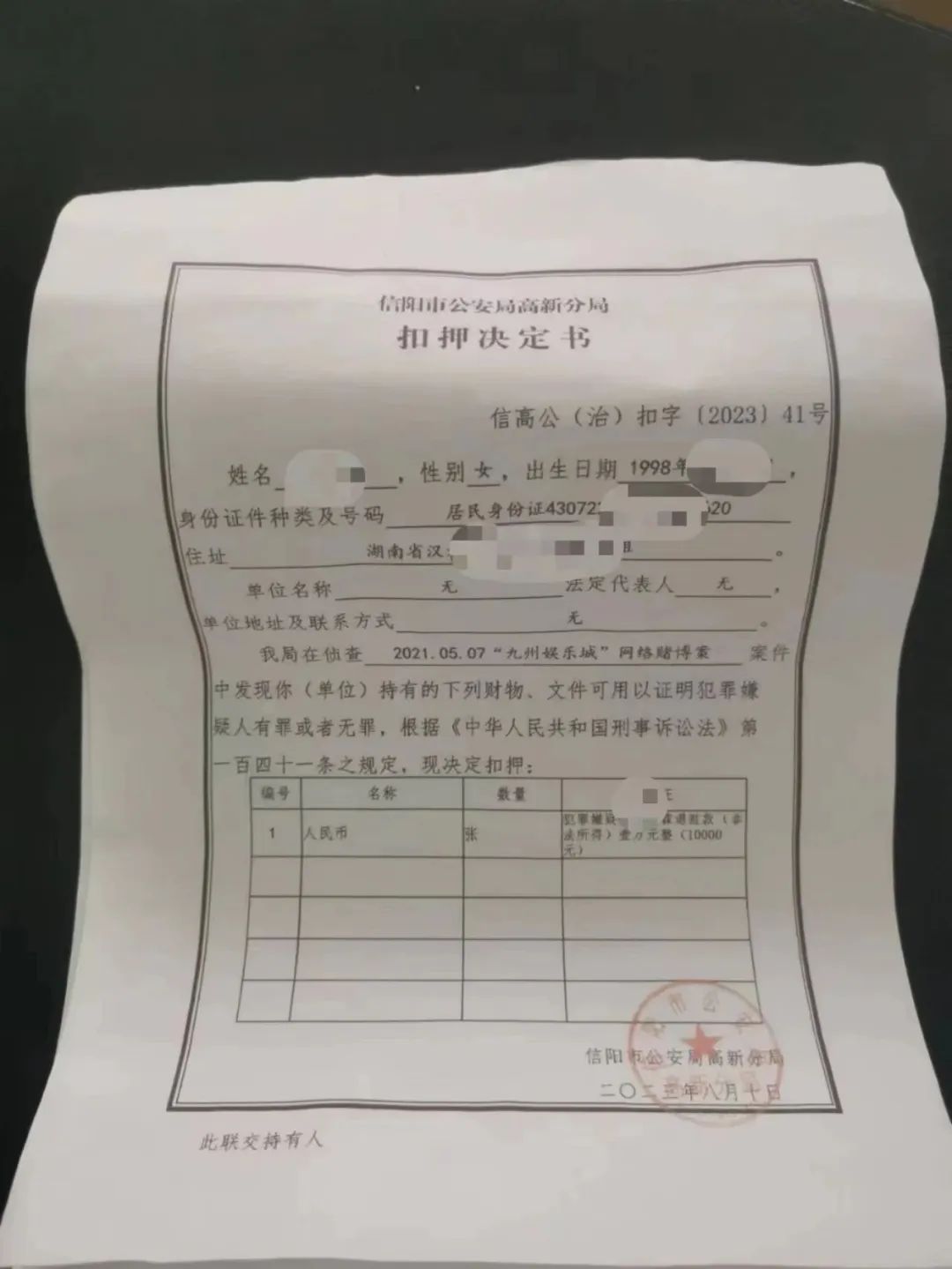 相關司法文書顯示,2021年5月7日,信陽市公安局高新分局接“信陽市打擊治理跨境賭博工作領導小組”信賭研令(2021)24號指令,將涉及“九州娛樂城”特大跨境賭博網站部分代理及窩點工作人員指定高新分局偵辦。