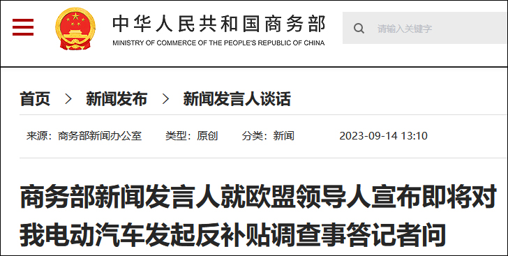據商務部網站9月14日消息,商務部新聞發言人就歐盟領導人宣佈即將對我電動汽車發起反補貼調查事答記者問。