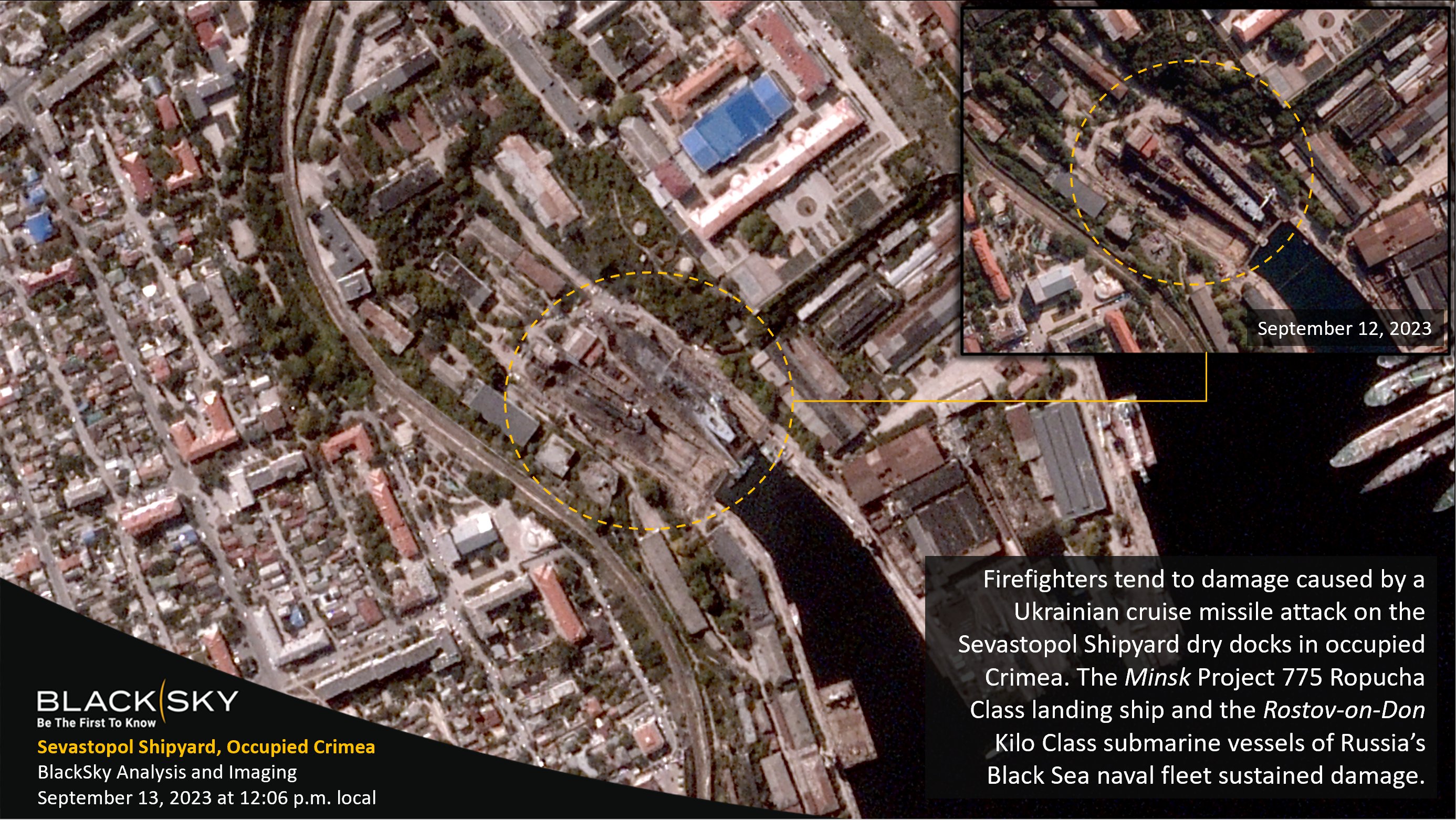 美國商業影像公司Black Sky13日晚間在社交平台上發佈了9月12日和13日襲擊當天拍攝的造船廠俯視圖像。圖像顯示,兩艘艦艇明顯受損。