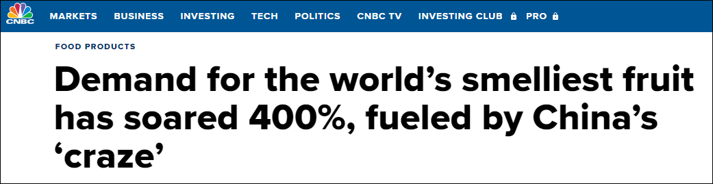 (觀察者網訊)據美國消費者新聞與商業頻道當地時間9月13日消息,滙豐銀行11日公佈的報告顯示,在中國消費者對榴蓮喜愛“熱潮”的推動下,全球對榴蓮的需求同比猛增400%。