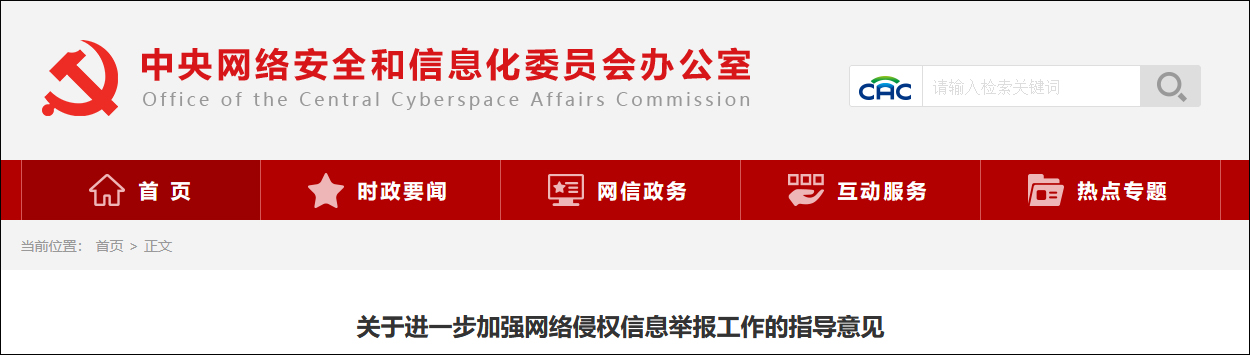 中央網信辦網站9月15日發佈《關於進一步加強網絡侵權信息舉報工作的指導意見》。
