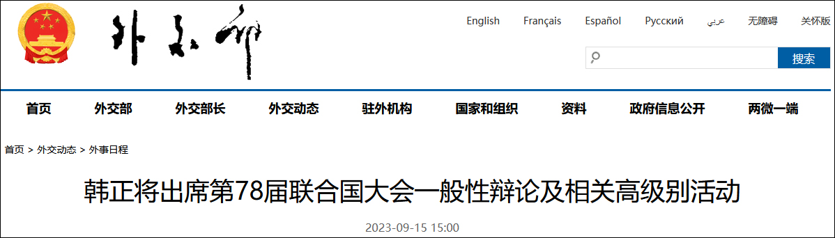另據北京日報客户端消息,在今天(15日)的外交部例行記者會上,有記者提問,發言人剛才宣佈韓正副主席將出席第78屆聯合國大會一般性辯論及相關高級別活動,請問中方對此訪有何期待?
