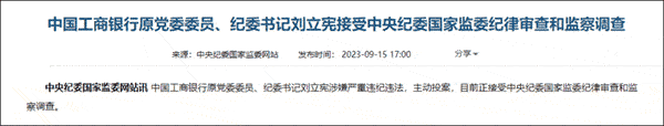 中國工商銀行原紀委書記劉立憲接受審查調查,系主動投案 None 2023-09-15 據中央紀委國家監委網站9月15日消息,中國工商銀行原黨委委員、紀委書記劉立憲涉嫌嚴重違紀違法,主動投案,目前正接受中央紀委國家監委紀律審查和監察調查。