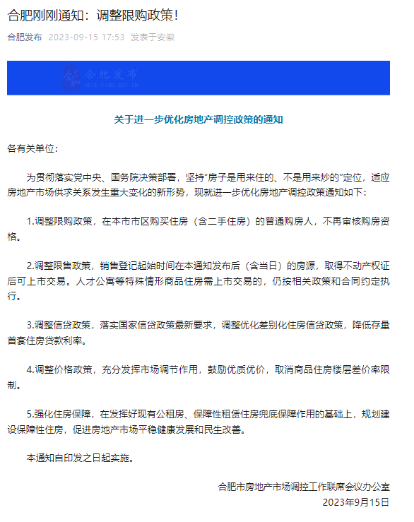 據合肥市人民政府新聞辦公室“合肥發佈”9月15日消息,合肥市房地產市場調控工作聯席會議辦公室發佈關於進一步優化房地產調控政策的通知。
