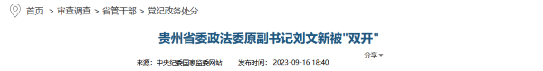 據中央紀委國家監委網站9月16日消息,據貴州省紀委監委消息:日前,經貴州省委批准,貴州省紀委監委對貴州省委政法委原副書記劉文新嚴重違紀違法問題進行了立案審查調查。
