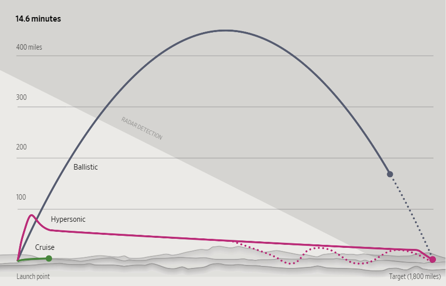 巡航導彈(綠色)和彈道導彈(藍色)以及高超音速武器(粉色)的近似速度和軌跡對比,高超音速導彈被拉昇到空中,然後高速滑翔到其打擊目標處。圖自《華爾街日報》