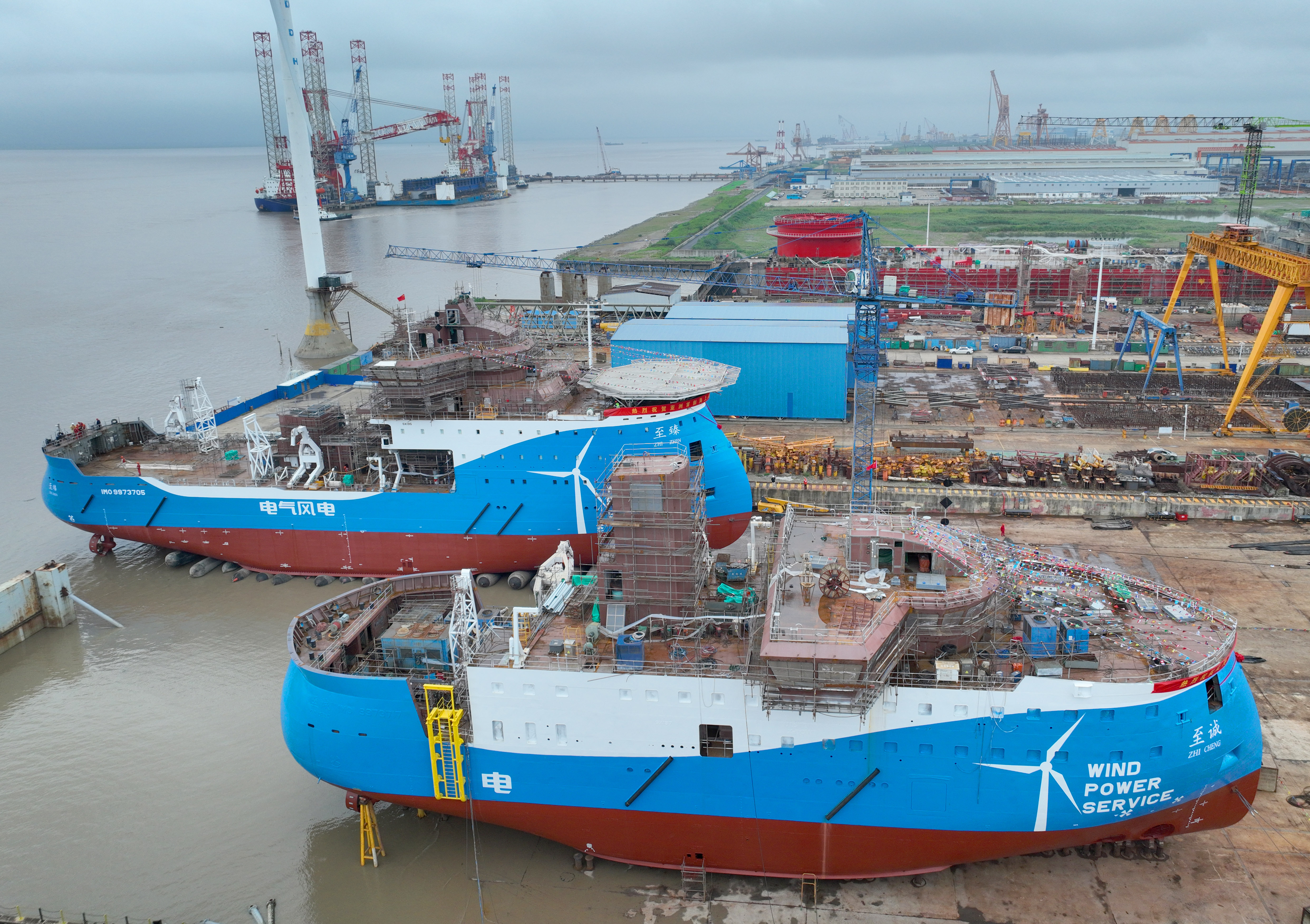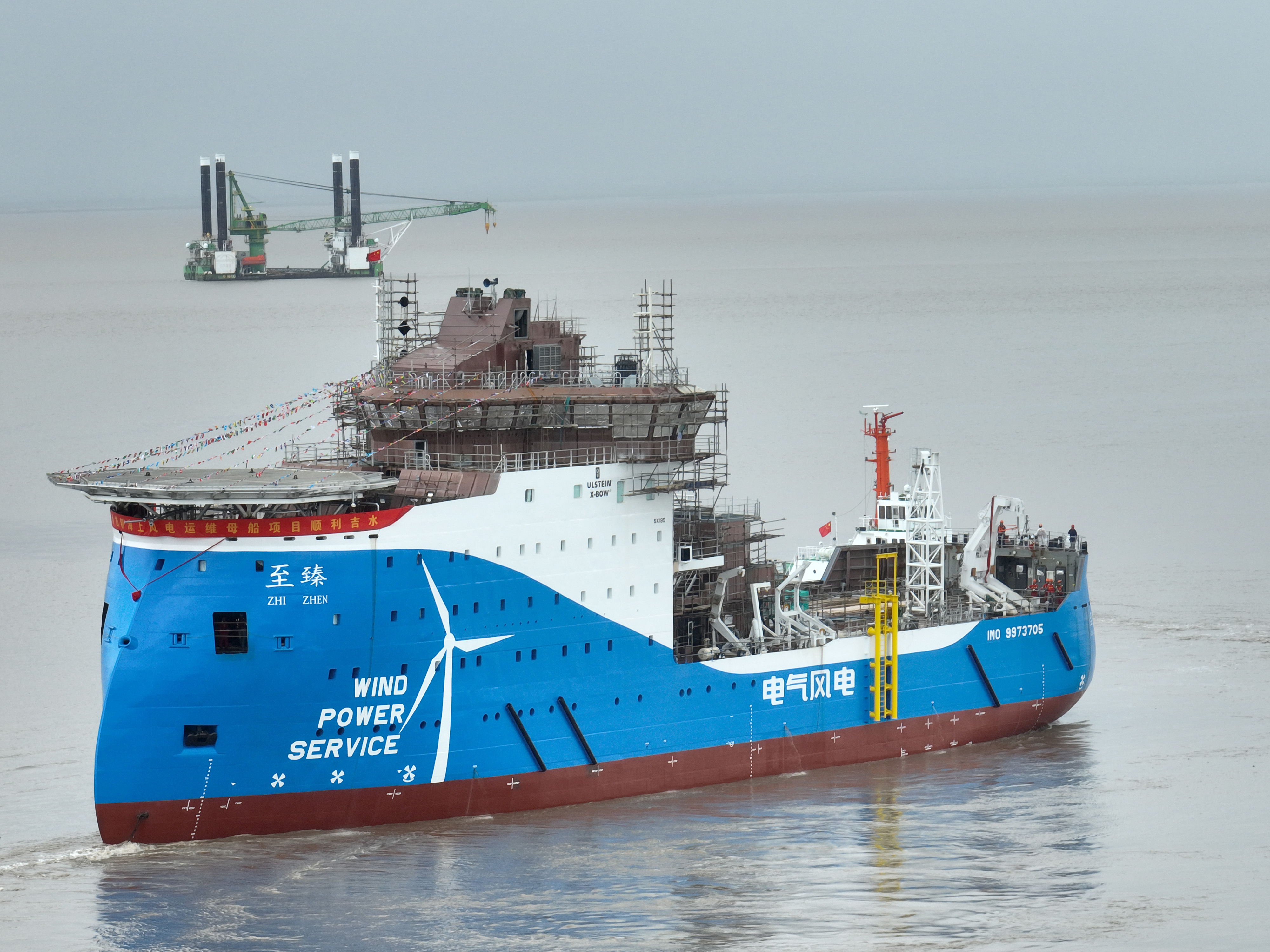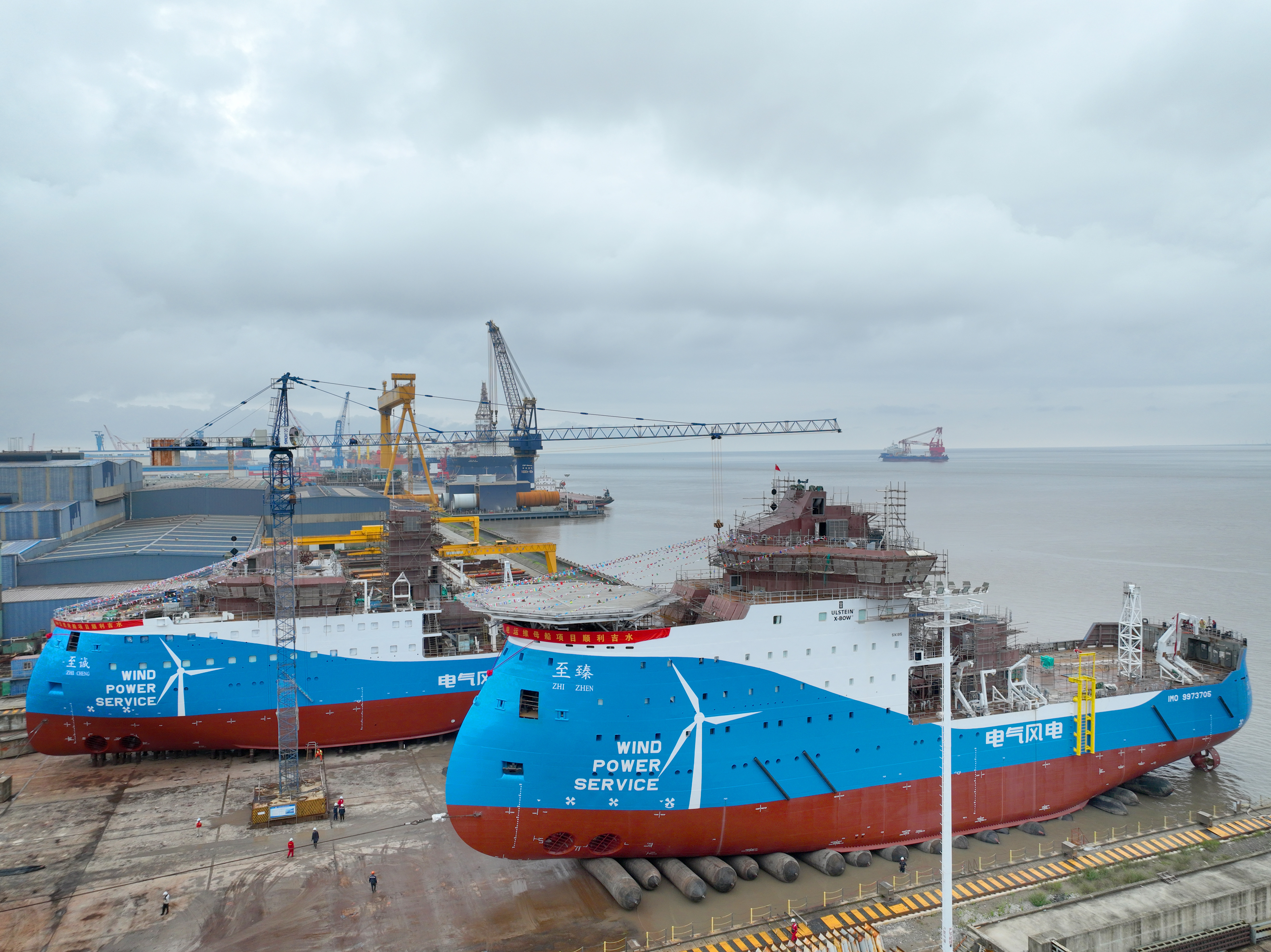 我國海上風電開發再添利器!兩艘風電運維母船在江蘇啓東下水
