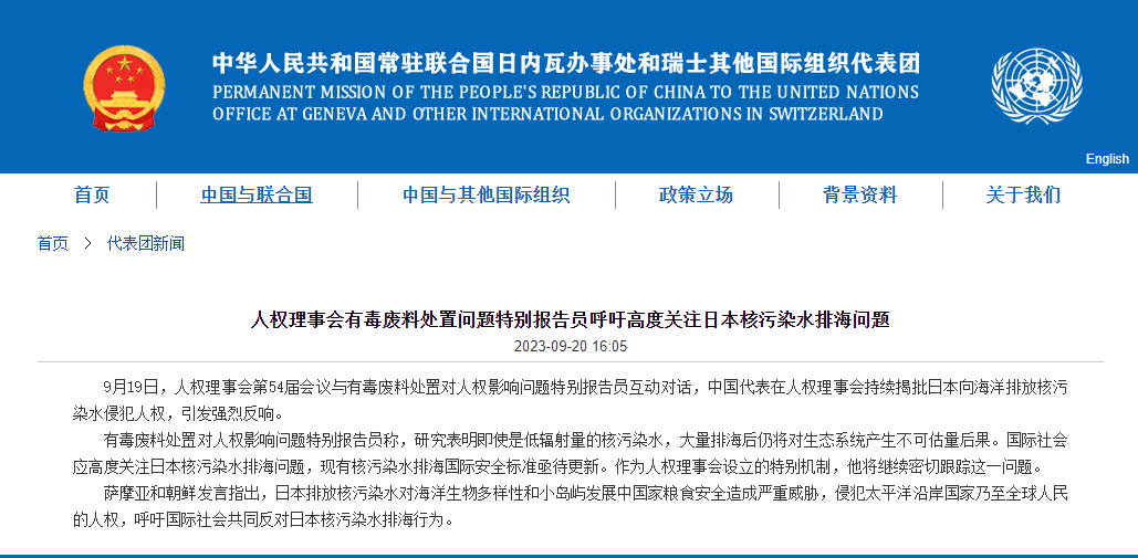 中國常駐聯合國代表團網站消息,9月19日,人權理事會第54屆會議與有毒廢料處置對人權影響問題特別報告員互動對話,中國代表在人權理事會持續揭批日本向海洋排放核污染水侵犯人權,引發強烈反響。